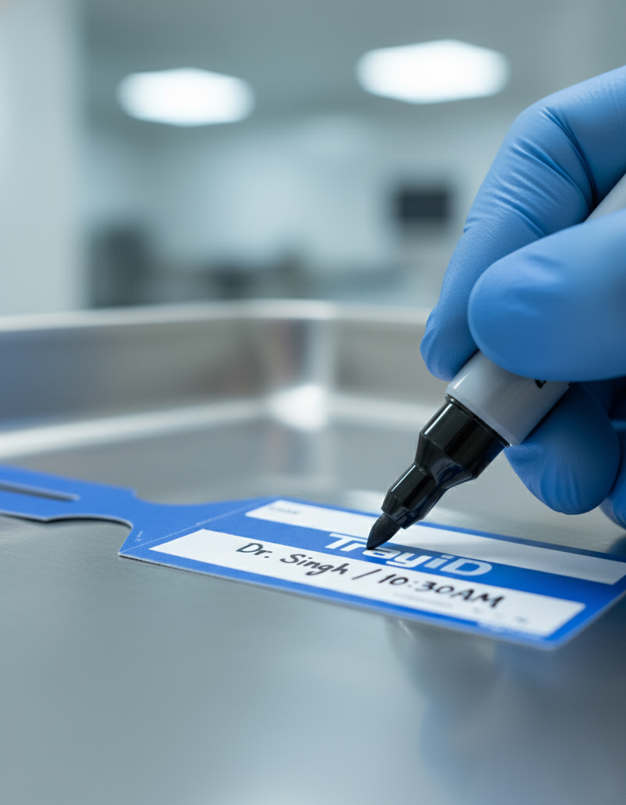 TrayID’s patent-pending, medical-grade adhesive bonds instantly and stays secure through high heat, steam sterilization, and heavy washer cycles. No smearing, no curling, no residue—just reliable identification SPD can trust on every wrapped tray.